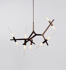 This item is a bronze, 120V, Agnes Chandelier with straight-cut glass. Overall condition is moderate with slight scratching on the finish.
