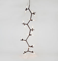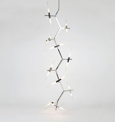 Originally conceived as a candelabra, Agnes takes its inspiration from the fictional heroine of the same name, a worker in the world's oldest profession during the 1849 California Gold Rush. The modular system would allow Agnes easy setup in her makeshift "workspace." In this version, glowing glass tubes replace the candles. Articulated joints allow the glass to be arranged in a multitude of ways.