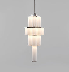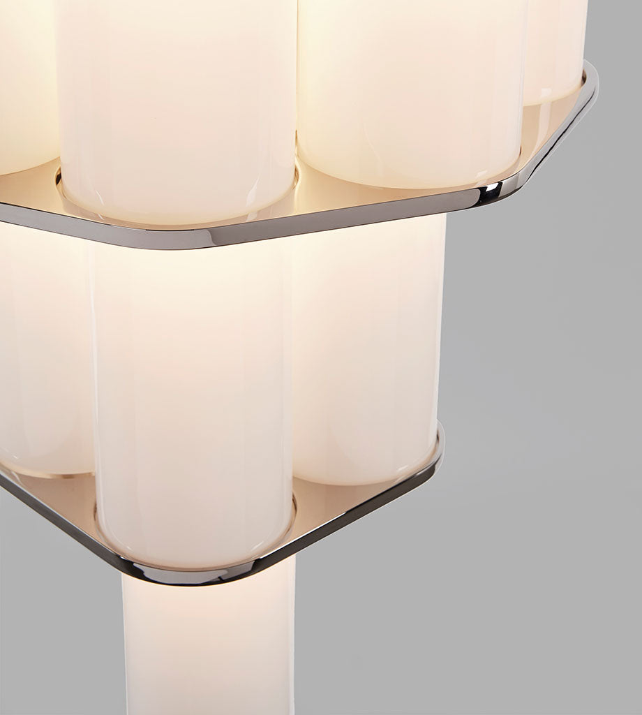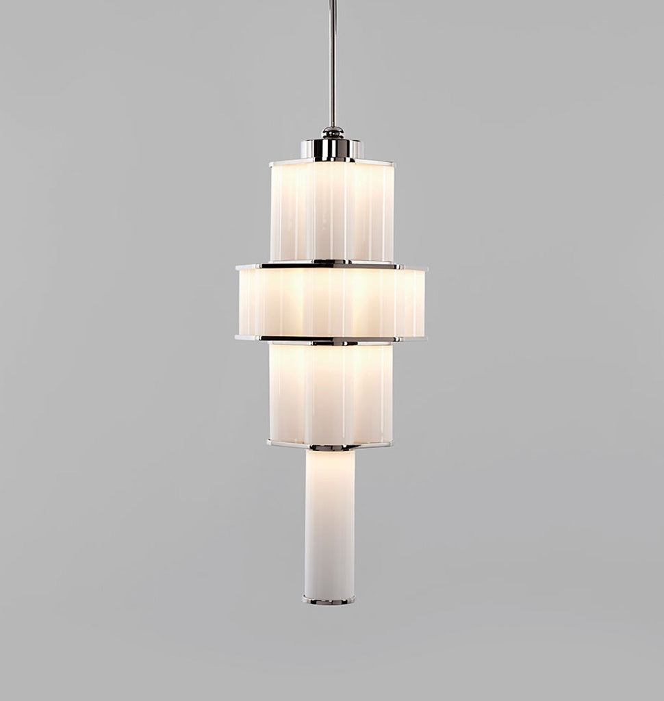 Jason Miller's Bauer is a pendant fixture made of stacked, concentric clusters of handblown tubular glass. The glass fades from dark to light, recalling the tonalities of earth-to-sky views, producing an ethereal, atmospheric effect.