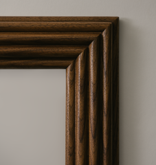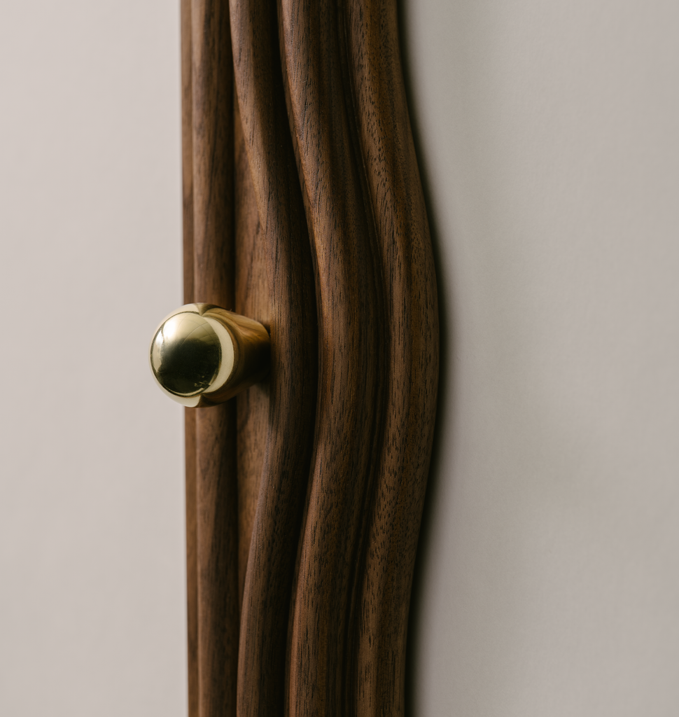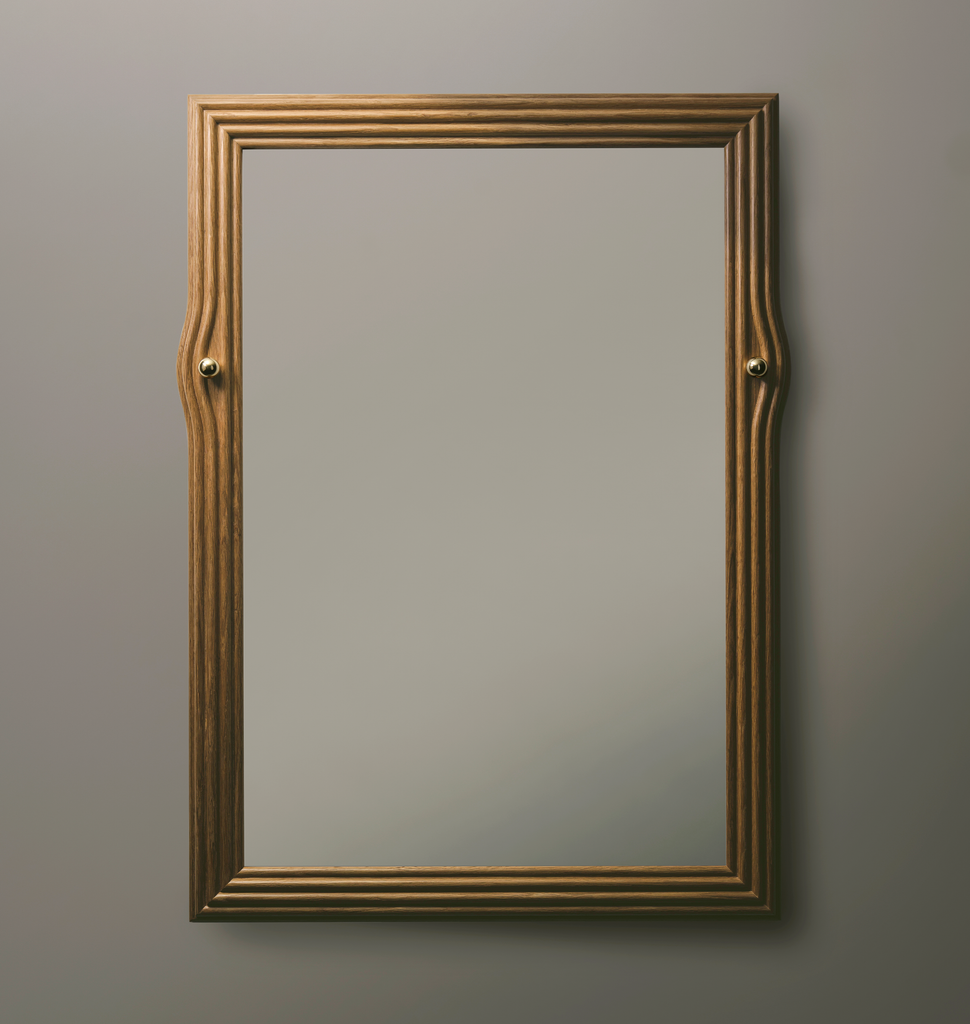Bend merges the mirror hanging hardware and the frame to create a subtle but distinctive design. Two screws with brass knobs pierce the frame forcing the reeded detail to bend around them like a river bending around a rock.