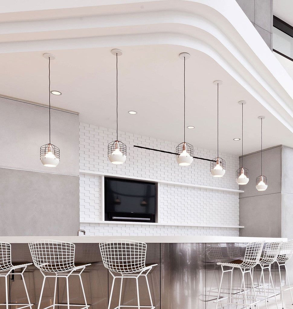 8-inch Bluff City pendant in white and black. Ships with 12-foot cord. Length can be adjusted on site. Bulbs not included, please purchase separately.