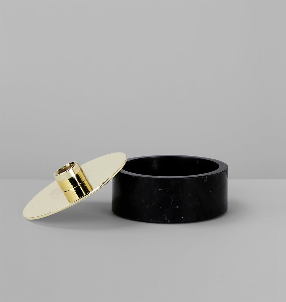 Black marble Cache candle holder with removable polished brass top and hollow stone base. Candles sold separately.
