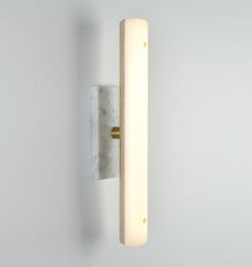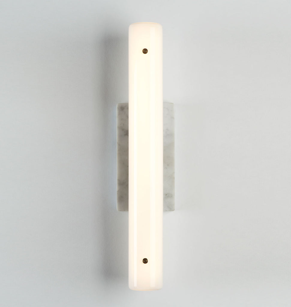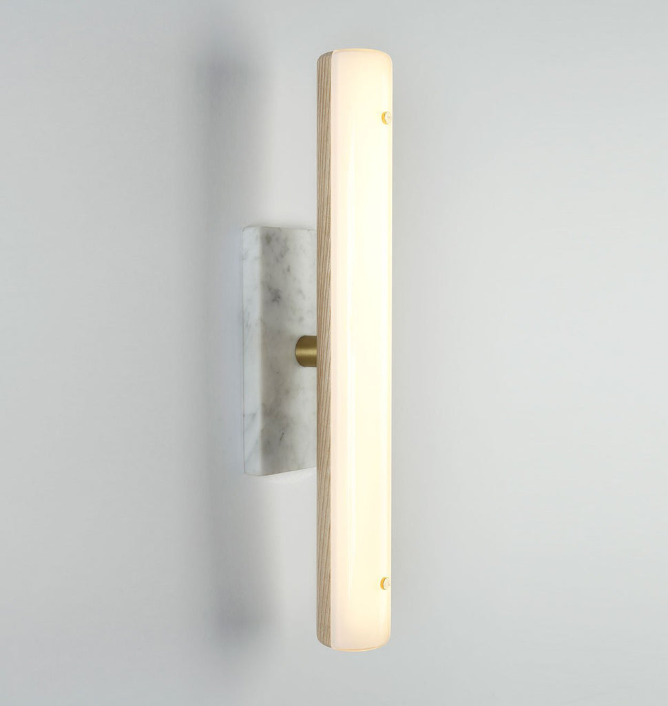 Counterweight is a series of LED fixtures made of gently arching, steam-bent wood that uses marble and brass as ballasts. Whether acting to counterbalance the lamp of the pendant light, or fixed as the base of the sconce, the mass of the stone and metal acts as a foil to the otherwise lightweight frames.