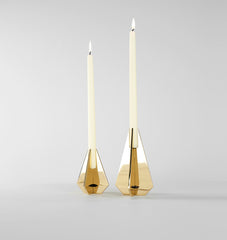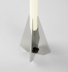 A two-dimensional shape, when crossed with another, becomes a three-dimensional object. This is the inspiration for a series of candlesticks by Bec Brittain, flat metal forms are interlocked and held together by a small leather keystone to create beautiful, functional objects.
