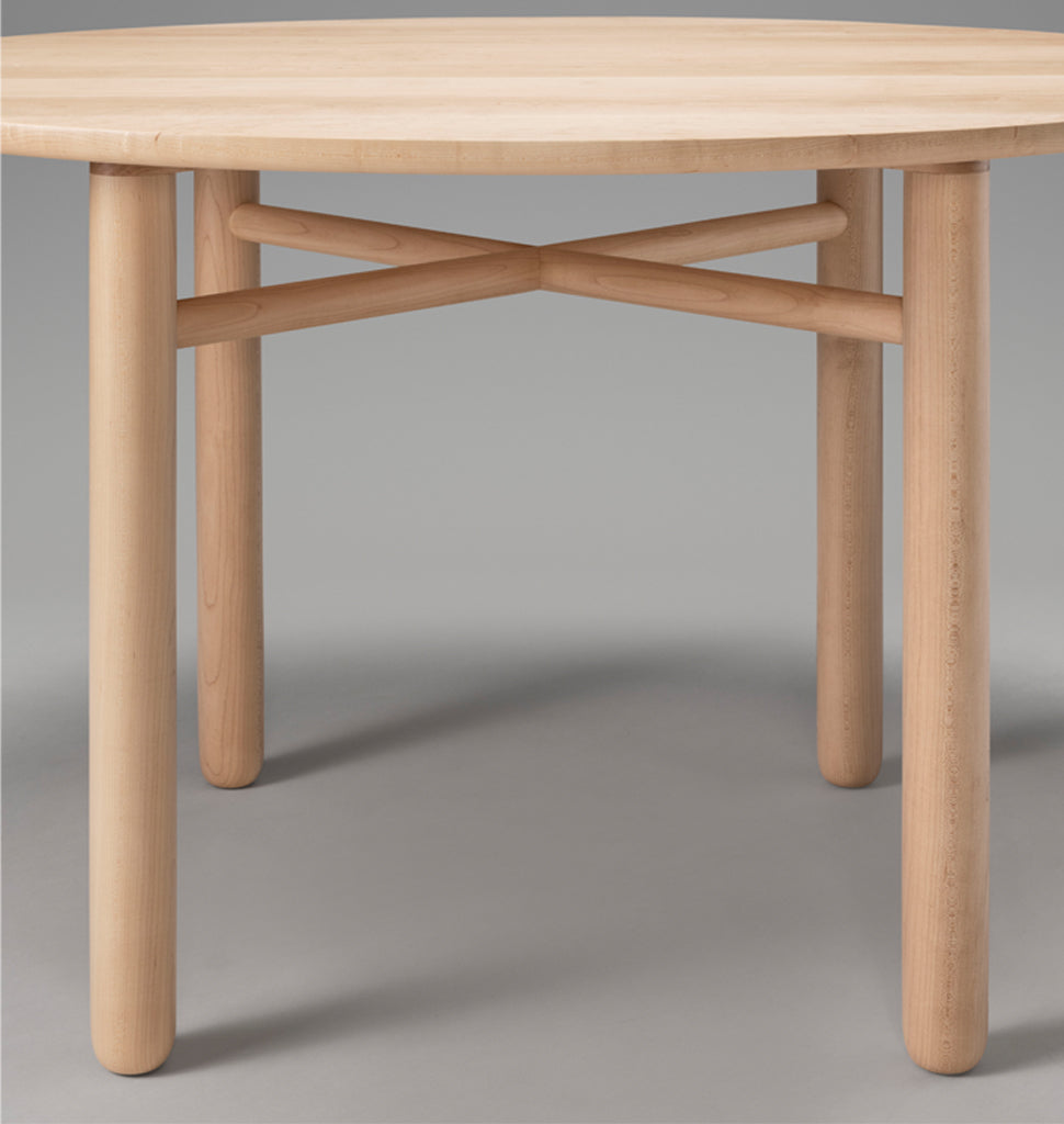Refined and minimal, this round dining table has thickened, turned legs with a subtle, organic profile. The edge detail on the top is molded to the shape of the human hand and soft to the touch. Complex yet elegant wooden joinery gives this table a sense of craft and lightness. Campagna worked closely with Bowen Liu Studio in refining the joinery for Cross Bar Table. The final form owes much to the collaboration.