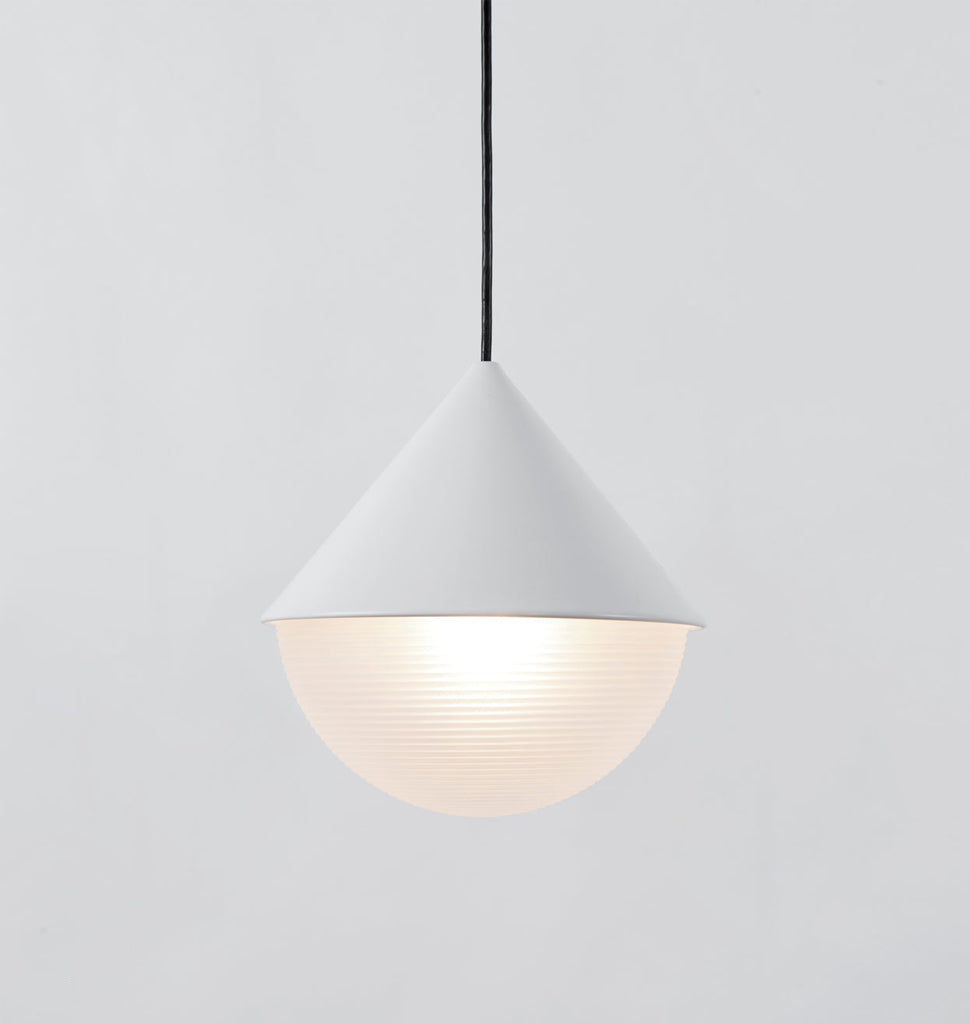 White Half & Half pendant with a hemisphere, ribbed-glass shade in a clear frosted finish. Ships with 12-foot cord. Length can be adjusted on site.