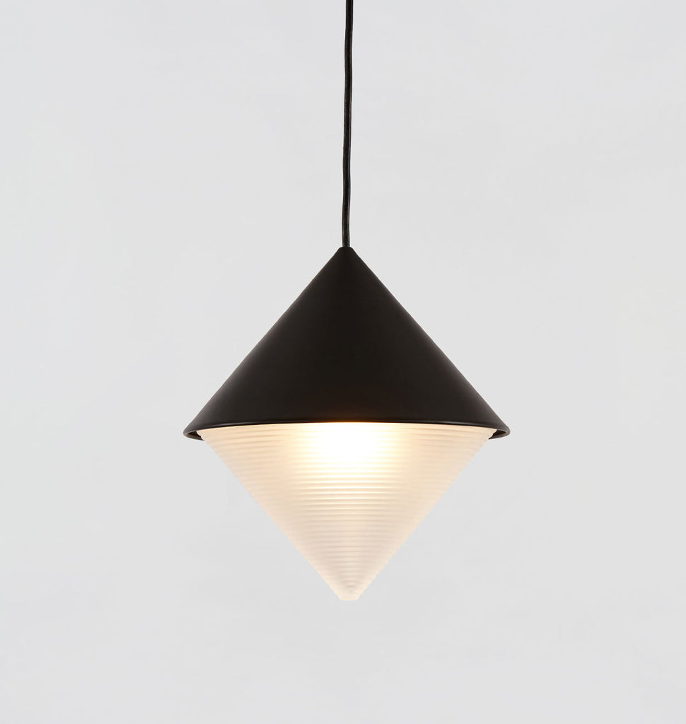 Black Half & Half pendant with a cone, ribbed-glass shade in a clear frosted finish. Ships with 12-foot cord. Length can be adjusted on site.