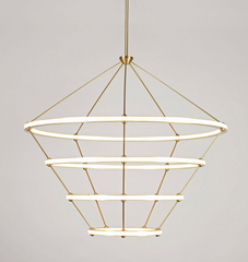 This item is a brushed brass, 120V, Halo Chandelier - 4 rings. Overall condition is moderate with a patinated finish.