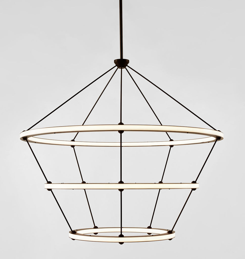 Paul Loebach envisioned the Halo series as a graceful exercise in the use of energy-efficient LED technology. The collection, which includes a range of ceiling and wall lights, is distinguished by its use of cascading rings and bars of light.