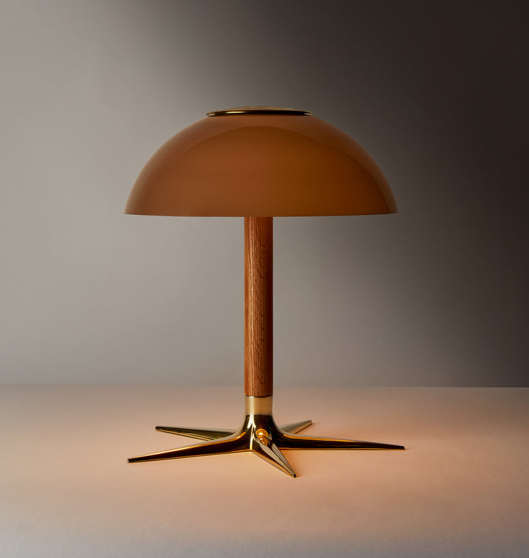 A star-shaped, polished unlacquered brass base anchors a white oak stem and Italian glass shade. Composed of three unique elements perfectly mixed to create a graceful table lamp embracing the old and the new, stars and mushrooms.