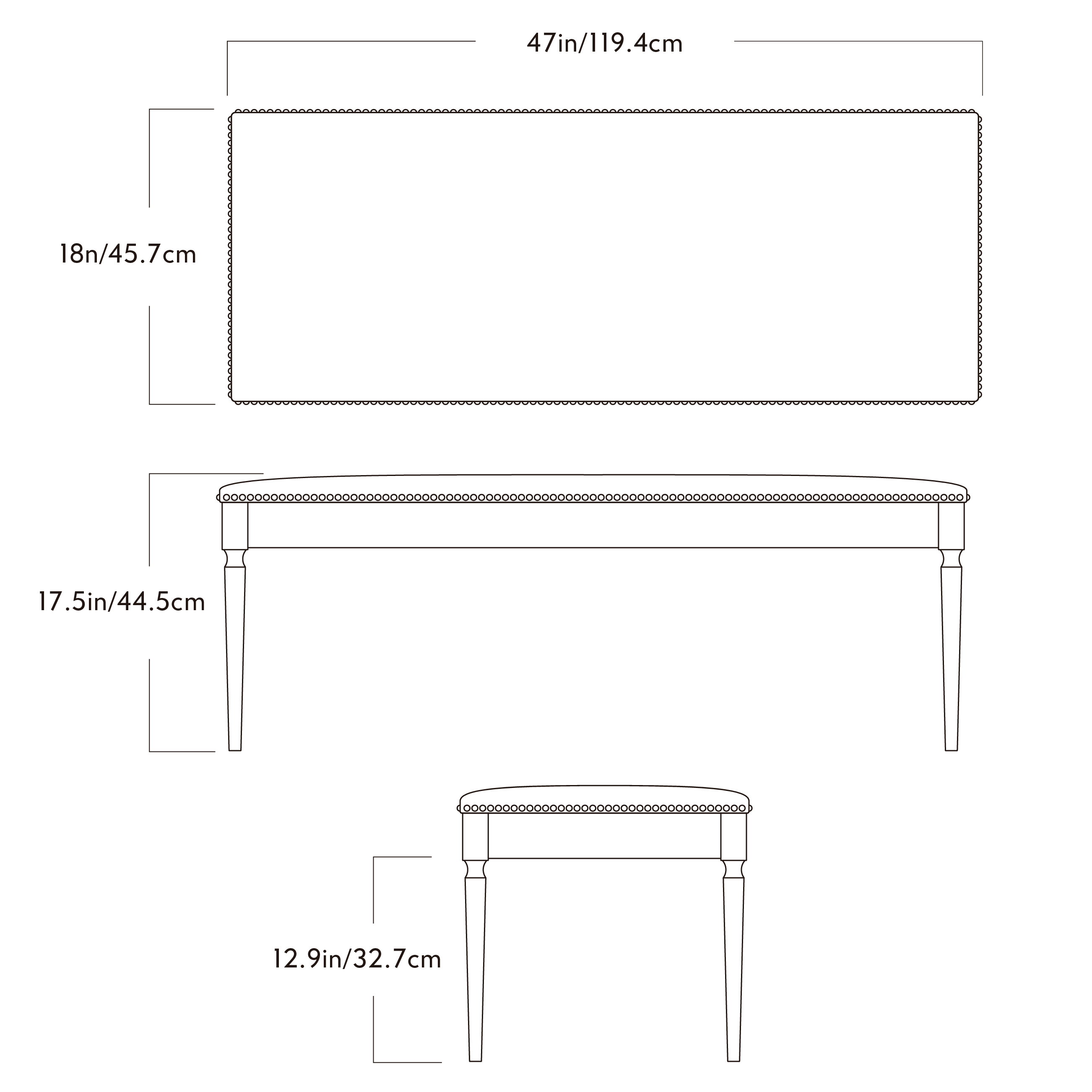 - D 18in/45.7cm x W 47in/119.4cm x H 17.5in/44.5cm